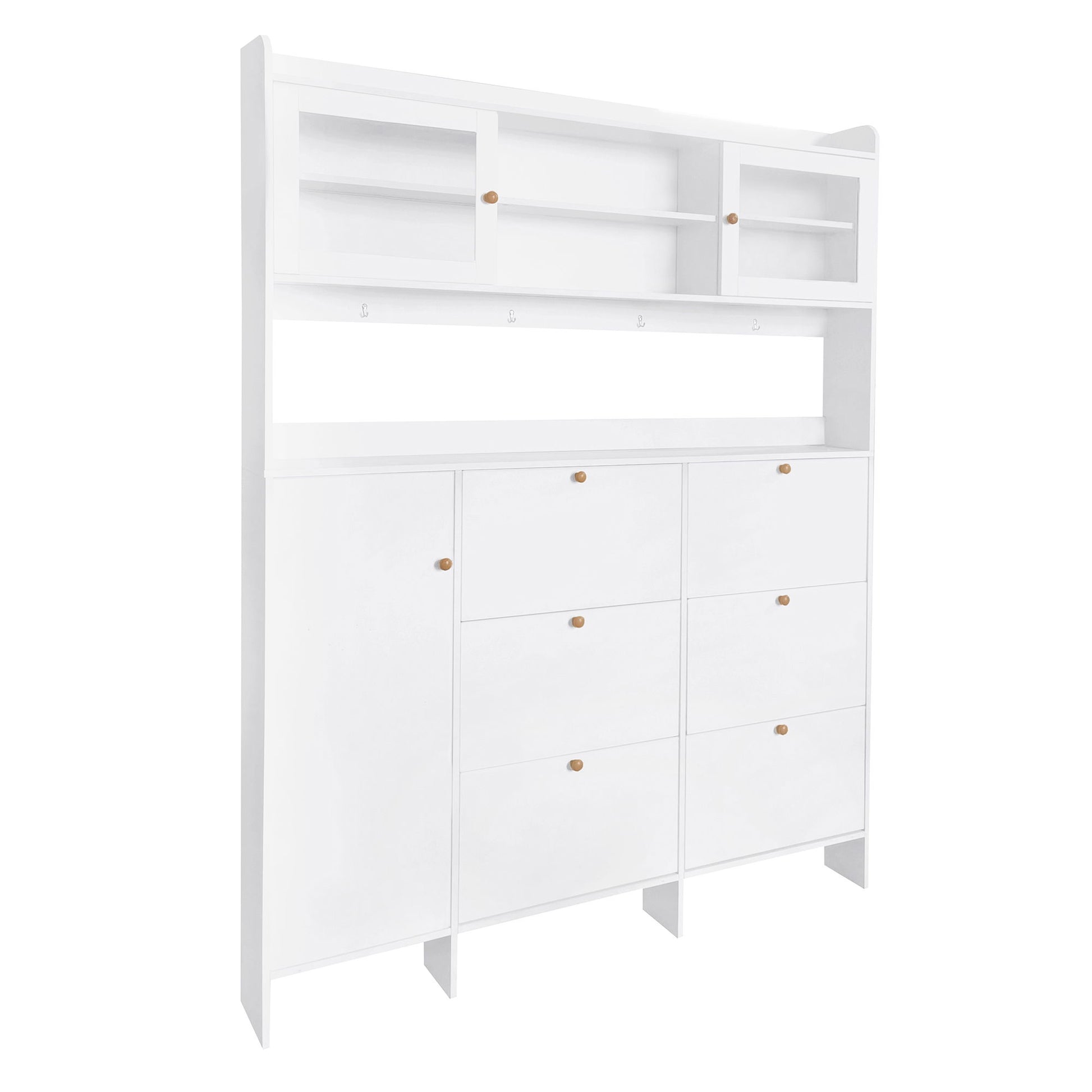 Multifunctional Tipping Bucket Shoe Cabinet With Storage Shelf & 6 Flip Drawers, Large Hall Tree With Tempered Glass Doors, Foyer Cabinet With 4 Hooks For Hallway - White