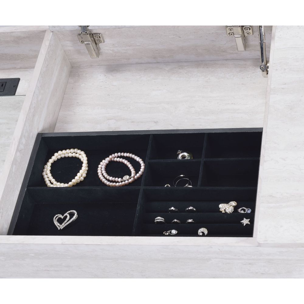 Simple yet fashionable, with features like three lift-top storage compartments that provide adequate space for makeup. The Saffron vanity desk has perfect construction because of these high-quality materials such as metal tubing and manufactured wood. With two color options for you to choose from white or black.